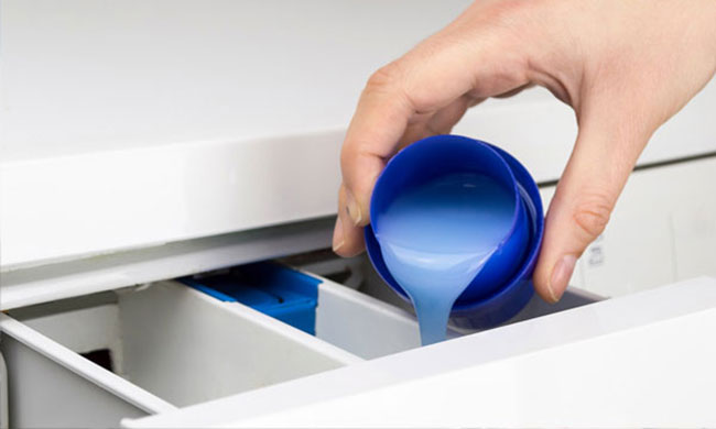 Đổ nước xả vào vào đầu quy trình giặt ở khay đựng chuyên dụng trên máy